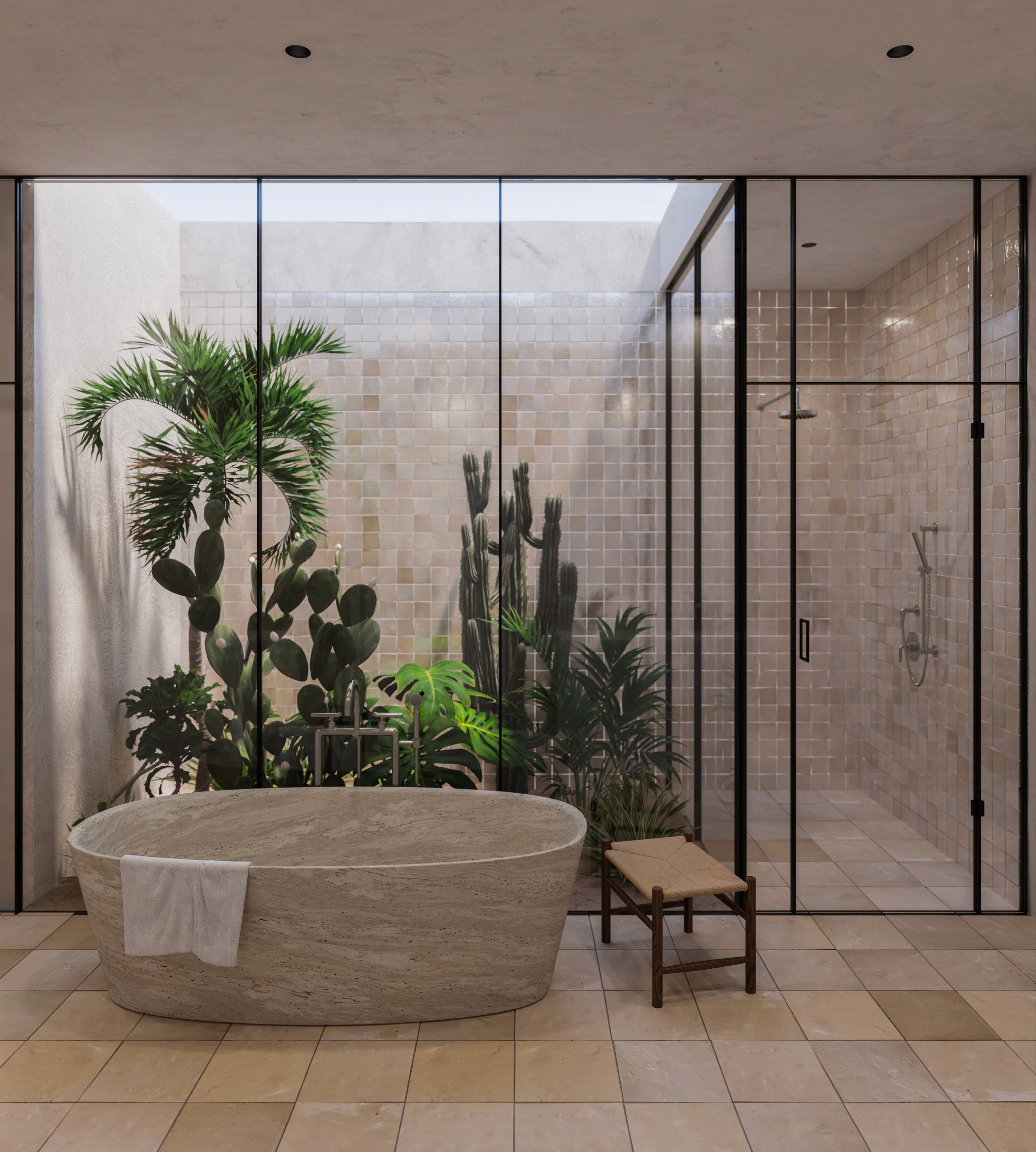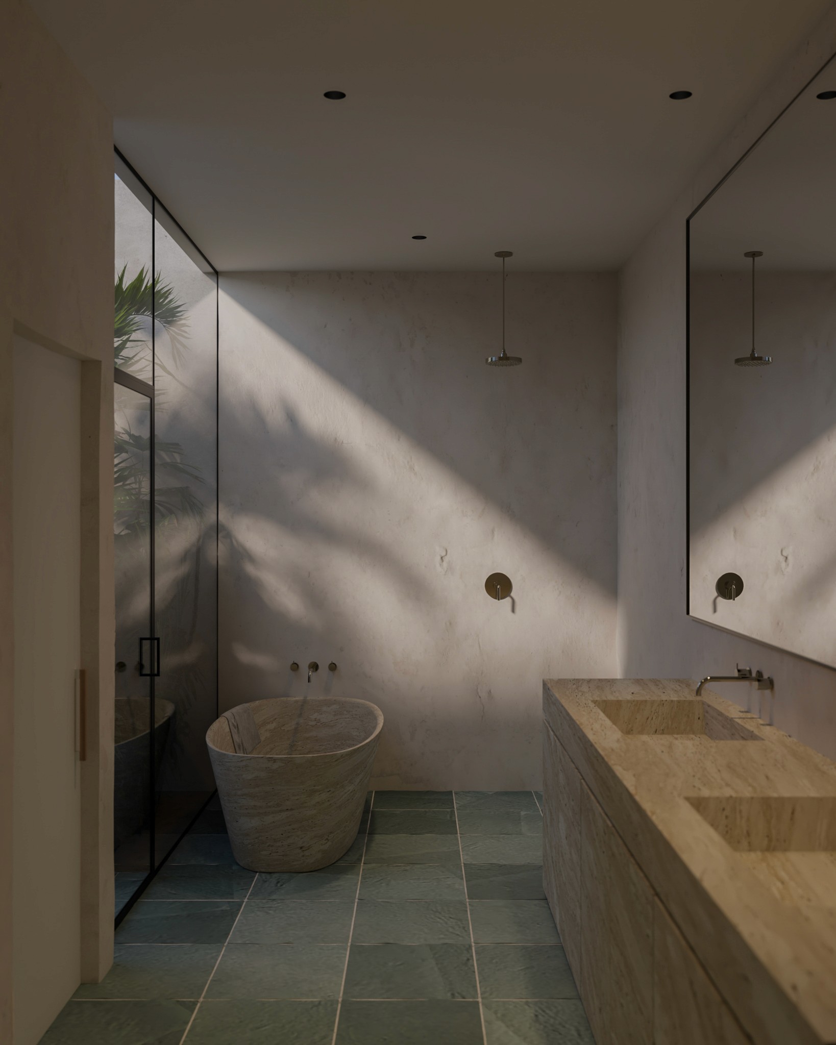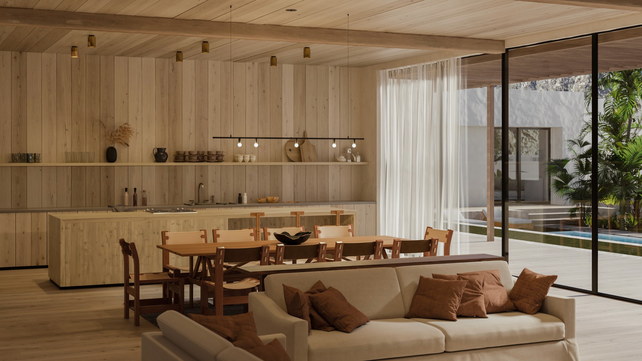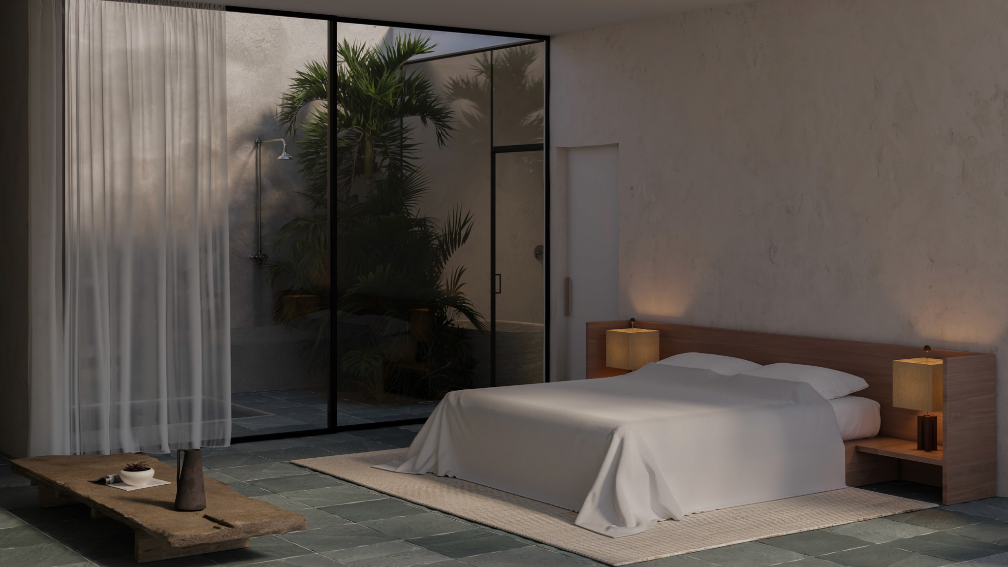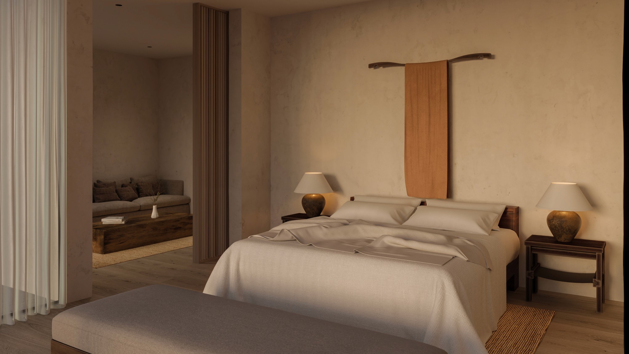 Step into the tranquil elegance of these holiday residences through our carefully crafted visualizations. Focused on natural finishes like rough plaster and wood, these renderings also incorporate a palette of subtle tones and strategic greenery, bringing each interior to life in an inviting and luxurious manner