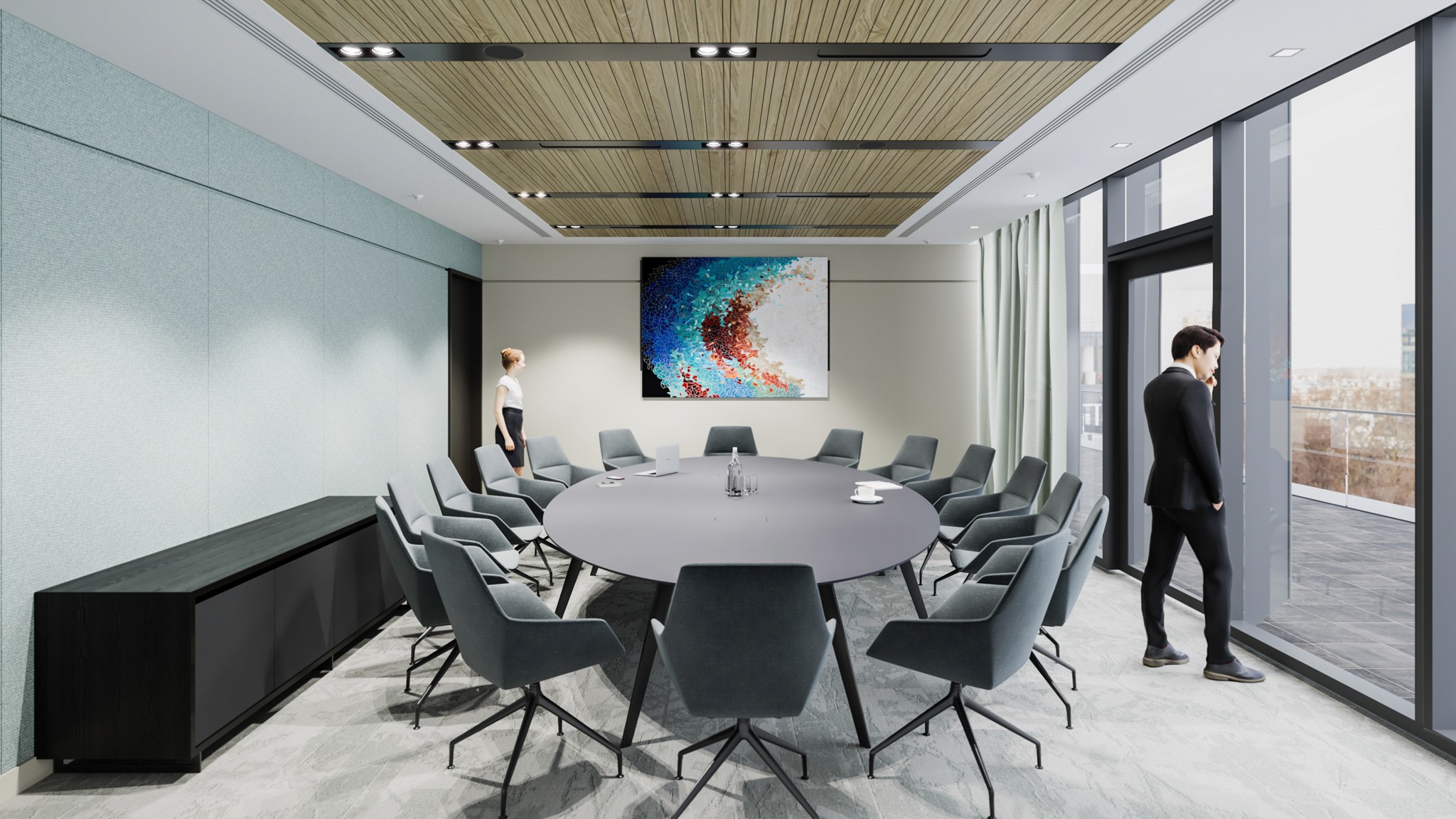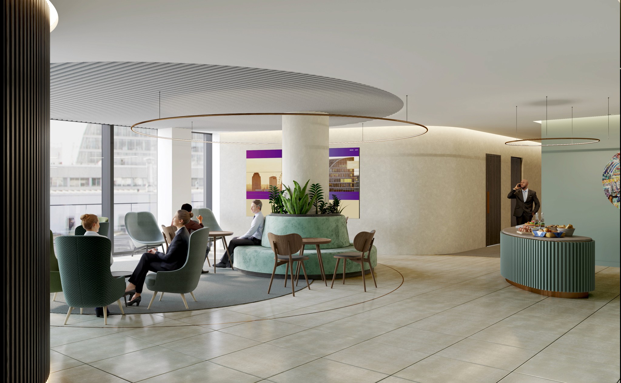 Visualized key areas including the reception, meeting rooms, and breakout spaces.